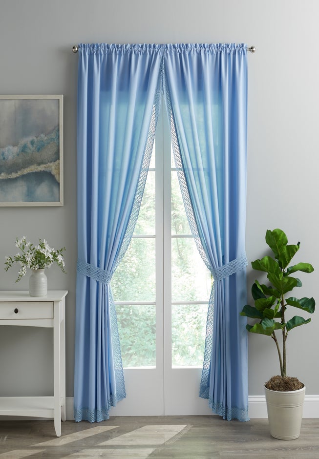 Bring soft sophistication and romantic charm to your home with the Lace Trim Tie-Back Panels light-filtering window treatments that instantly brighten any room. Their airy cotton weave and delicate lace trim create a gentle glow, adding coziness to bedrooms, living rooms, and family gathering spaces alike. Whether you're refreshing your décor with the changing seasons or layering with your favorite curtains, these panels add timeless elegance to every window. Includes 2 tie-back panels.