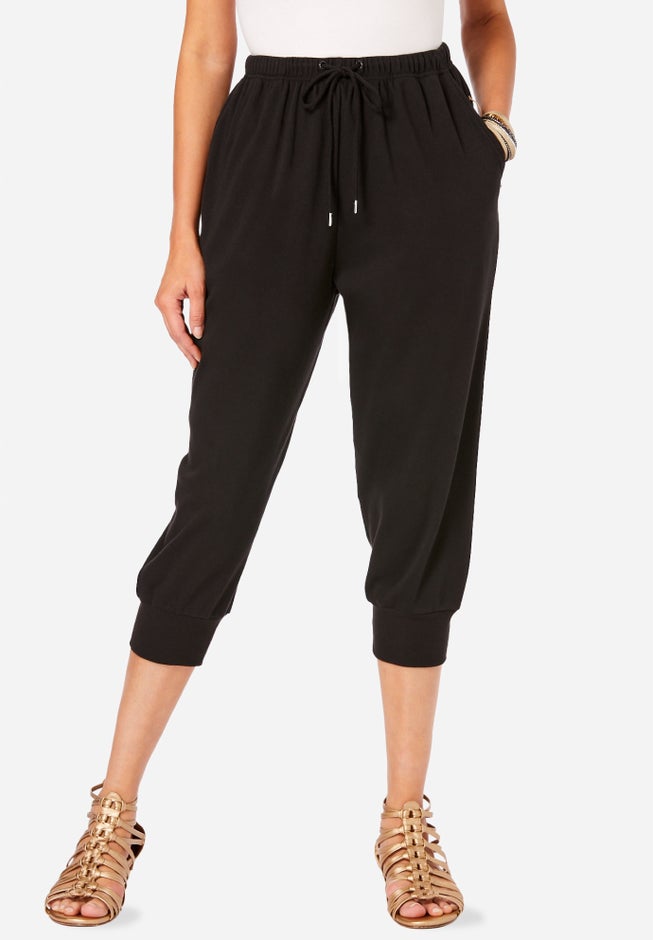 Grab a pair of these everyday capri pants featuring elasticized waist and cuffs, a functional drawstring and decorative grommets. Slant pockets.