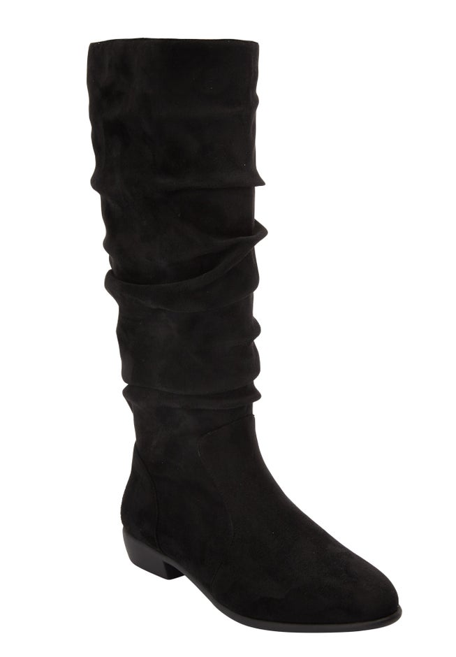 Faux suede wide calf scrunch shaft boots available in full and half sizes 7-11, 12 M, W, WW